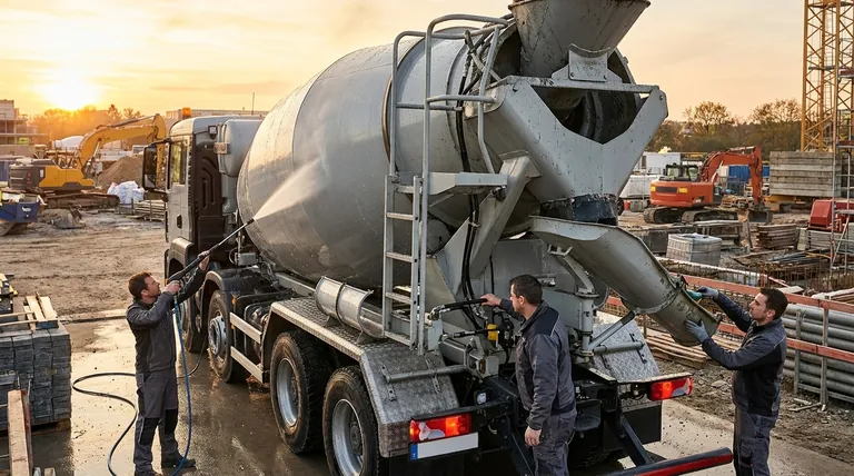 A thorough washout at the end of every workday is critical. This involves using the truck's onboard water system and often a high-pressure washer to remove all concrete residue from the drum's interior.