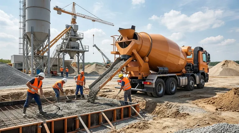 Optimal logistics involve synchronizing the mixer fleet's capacity with the plant's production rate to ensure a continuous, smooth flow of concrete to the site.