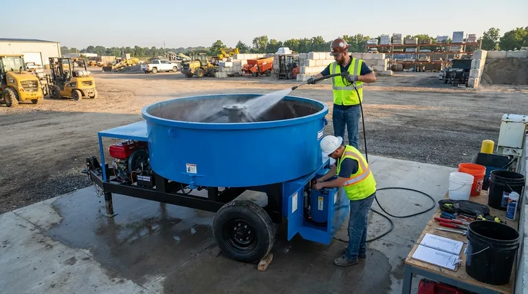 This is the single most important maintenance task. Immediately after discharging the concrete, you must clean the mixing drum thoroughly to prevent residual material from hardening. Hardened concrete drastically reduces mixing efficiency, can damage blades, and is extremely difficult and costly to remove.